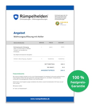 Bei dem Kostenbeispiel von einem Haus (ca. 100 Quadratmeter) und einer normalen Menge an Hausrat fallen etwa 2.400 € an, wogegen sich diese bei einem Keller von ca. 15 Quadratmetern auf etwa 595 € beschränken würden. Für eine individuelle Preisvorstellung bieten wir Ihnen eine unverbindliche und kostenlose Besichtigung mit Festpreis Angabe ohne versteckte Kosten an. Kontaktieren Sie uns uns telefonisch, per E-Mail oder über unser Online Kontaktformular!