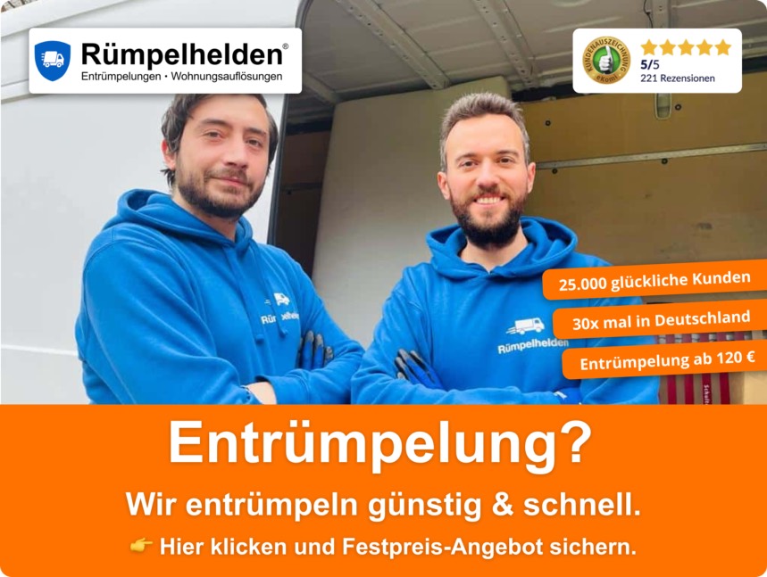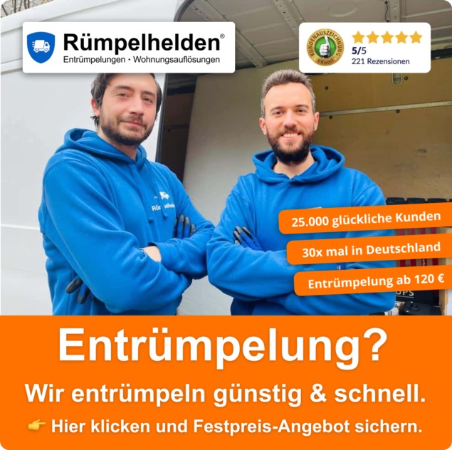 Die Kosten für eine Entrümpelung hängen von Größe, Zugänglichkeit und Füllgrad der Räume ab. Nach einer kostenlosen Besichtigung erhalten Sie von Rümpelhelden ein Festpreis-Angebot ohne versteckte Kosten. Im Preis enthalten sind Arbeitszeit, Transport, Entsorgung über zertifizierte Entsorgungsbetriebe und auf Wunsch einfache Rückbauarbeiten. Im Ratgeber „Was kostet eine Entrümpelung?“ auf unserer Website finden Sie Beispiele und Orientierung.